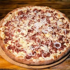 Molho de tomate encorpado como base, coberto por muçarela derretida que segura o sabor de fatias generosas de calabresa levemente tostadas. A cebola entra macia e adocicada, equilibrando a intensidade da carne, enquanto o orégano finaliza com aquele aroma clássico que faz essa combinação ser simplesmente infalível.