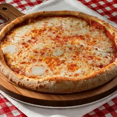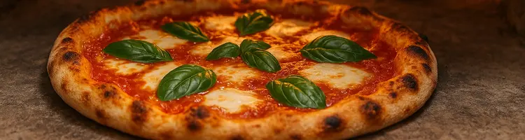 Pizza de muçarela no estilo napolitano, com massa de longa fermentação, molho de tomate equilibrado e queijo derretido, finalizada em alta temperatura para uma borda leve e aerada.